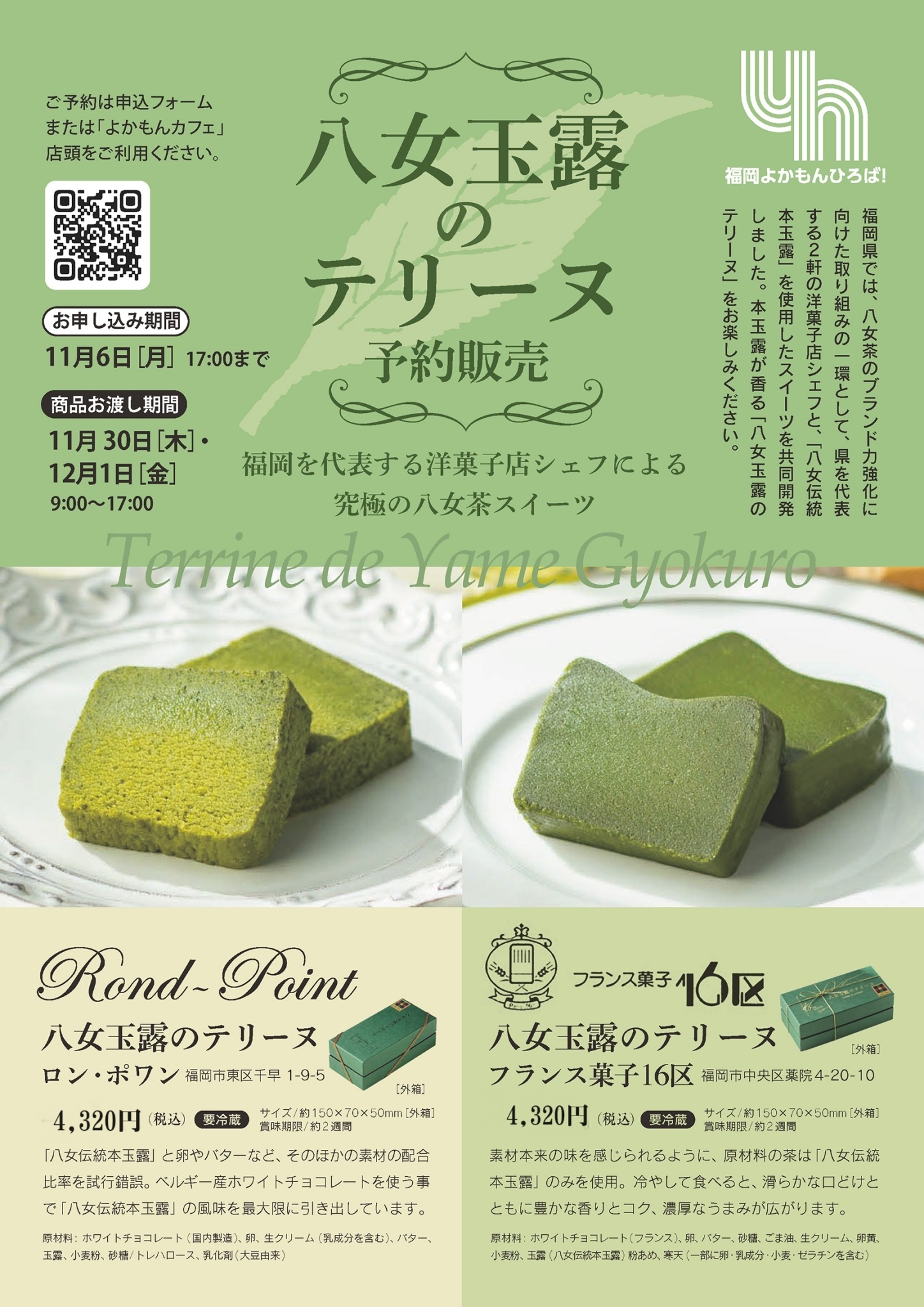 福岡県では、八女茶のブランド力強化に向けた取り組みの一環として、県を代表する2軒の洋菓子店シェフと、「八女伝統本玉露」 を使用したスイーツを共同開発しました。 本玉露が香る「八女玉露のテリーヌ」 をお楽しみください。