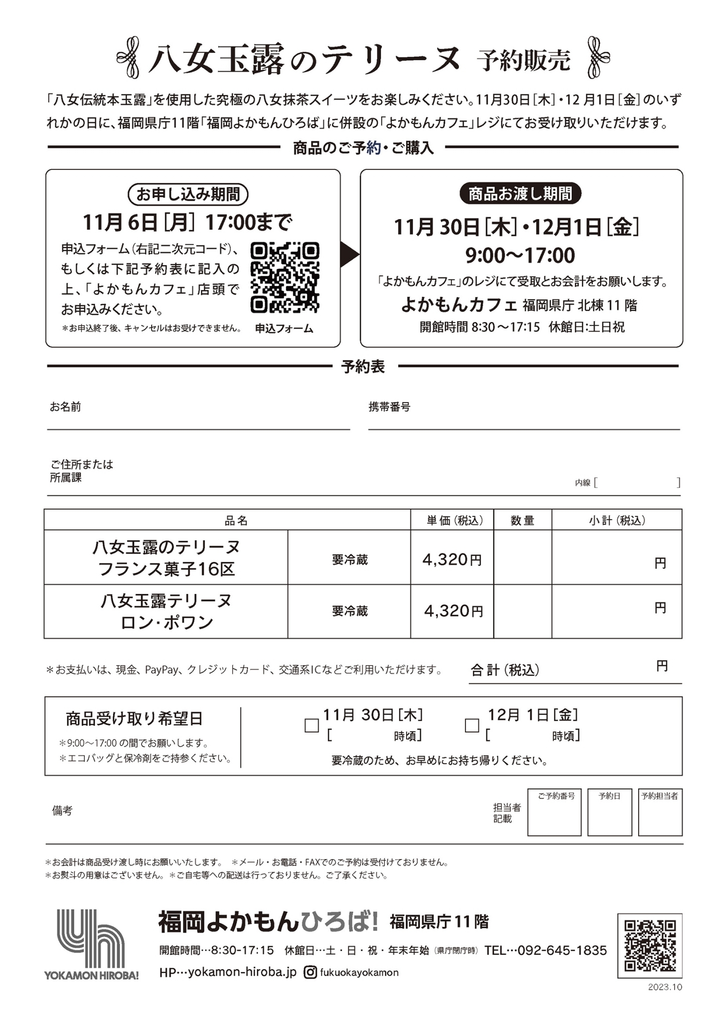 11月30日[木]・12 月1日[金]のいずれかの日に、福岡県庁11階「福岡よかもんひろば」に併設の「よかもんカフェ」レジにてお受け取りいただけます。